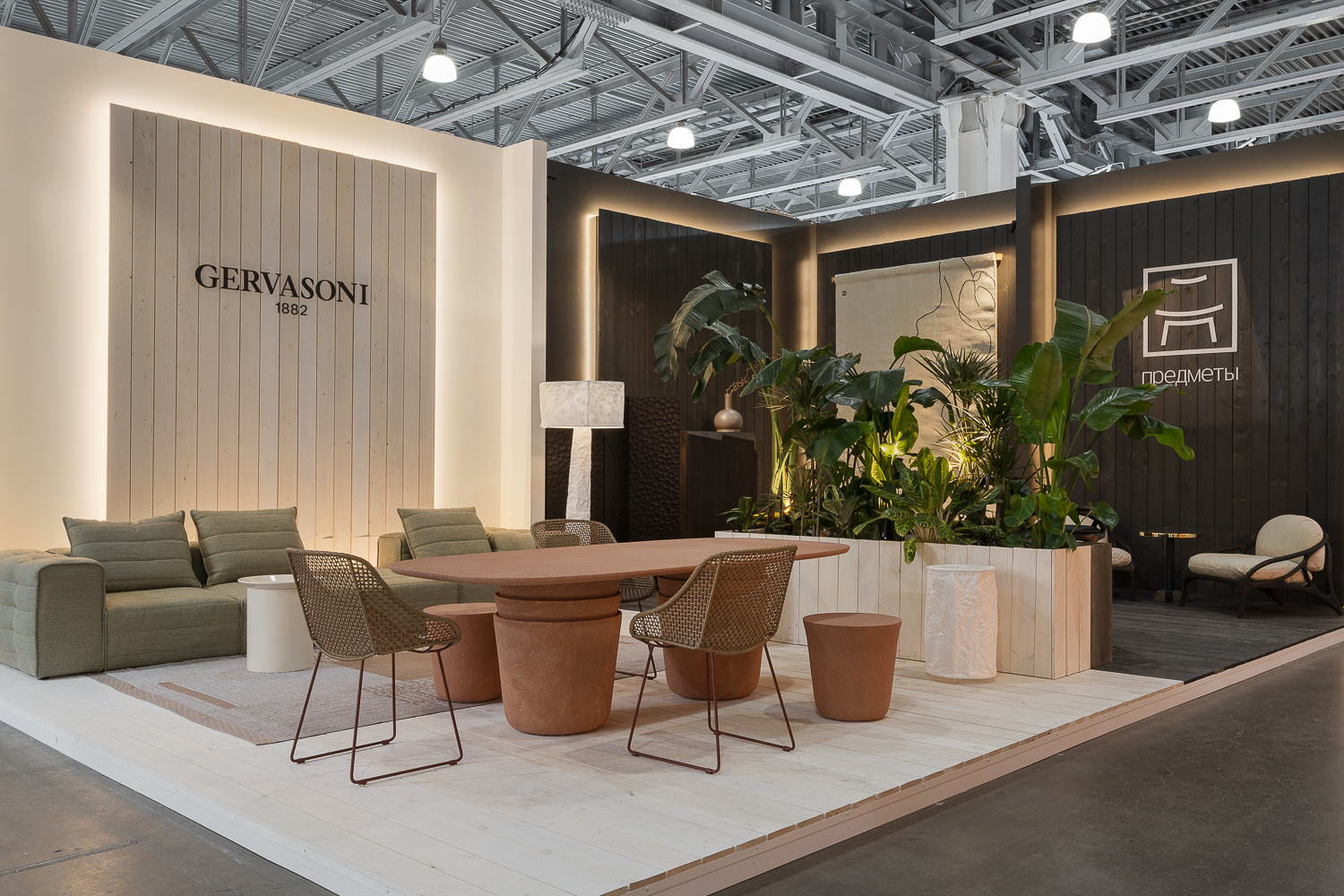 Противоположная часть стенда проникнута теплом и яркостью, словно солнечный летний день, озаряющий пространство радостью и энергией. Здесь были представлены уличные интерьерные решения знаменитого итальянского бренда Gervasoni 1882, известного своей лёгкой, светлой и тёплой эстетикой.